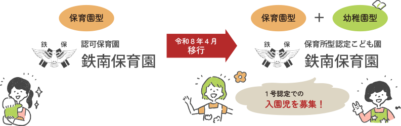 令和8年4月より、鉄南保育園は「認可保育園」から「保育所型認定こども園 鉄南保育園」へ移行します。