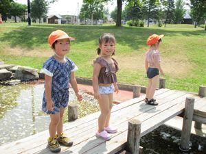 毎日暑い日が続き、子どもたちも水遊びが大好きになりました。札内北公園はちょっとした滝があったり、水路が長く川が流れているようです