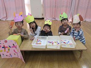 3~5才児のお買い物ごっこがありました。お店を回って、お面のパーツを集めて自分だけのお面を作りましたよ♪帯屋・耳屋・鼻屋・飾り屋・ジュース屋・麦チョコすくいと交代で、店番とお客さんをしました。製作コーナーでは、買ってきたパーツを組み立ててお面を完成させフォトスポットで撮影会をしました!
