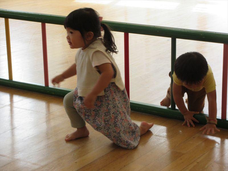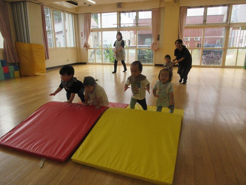 今日は0.1.2歳のミニ運動会が行われました。0歳と1歳はお山登り・降り、2歳ははしごくぐりを行いました。