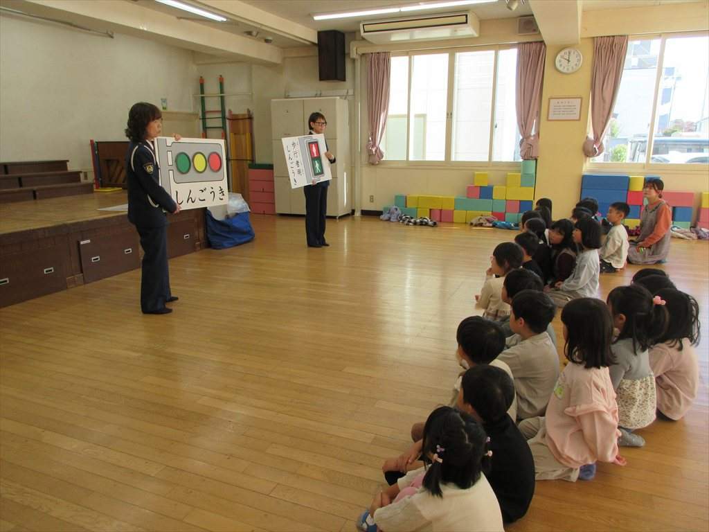 とまる・みる・まつとお約束を確認したり、道路を渡る時にきをつけることなどの話を真剣に聞いていました。