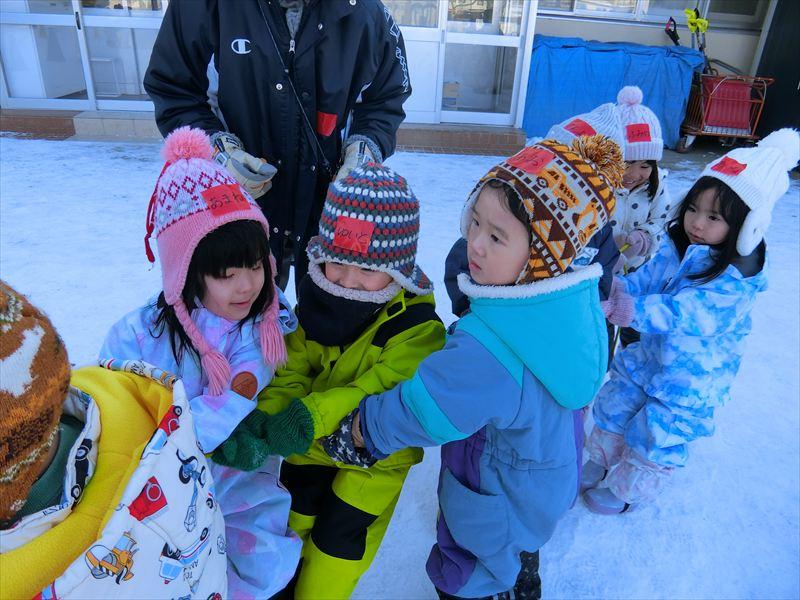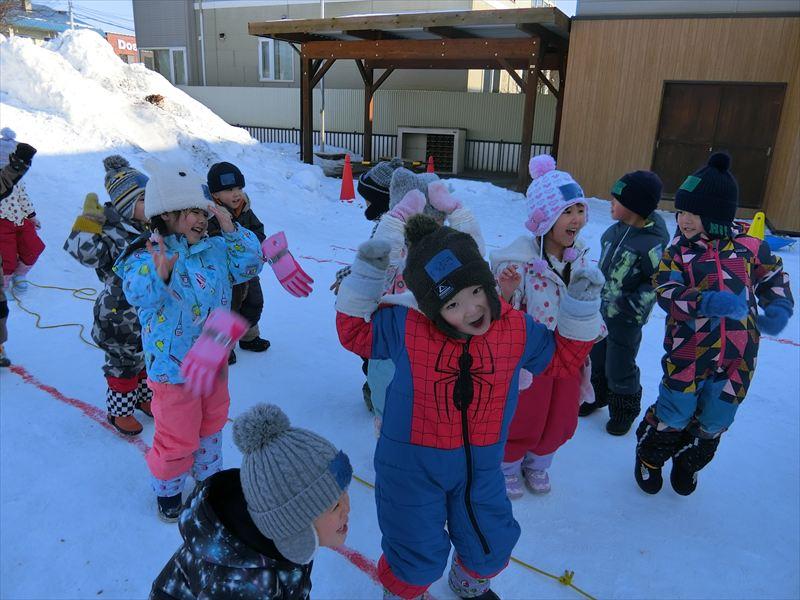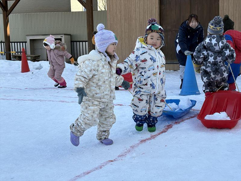 今年度2回目のふれあいの日は、らっこ、ぱんだ、ひまわり(4才児)のみんなが4チームに分かれ、雪中運動会を行いました。チームごとにひまわりさんがリードし、「綱引き」「雪運び競争」を楽しみました。いつもとは違う雪上での競技に、みんな大喜びでした。