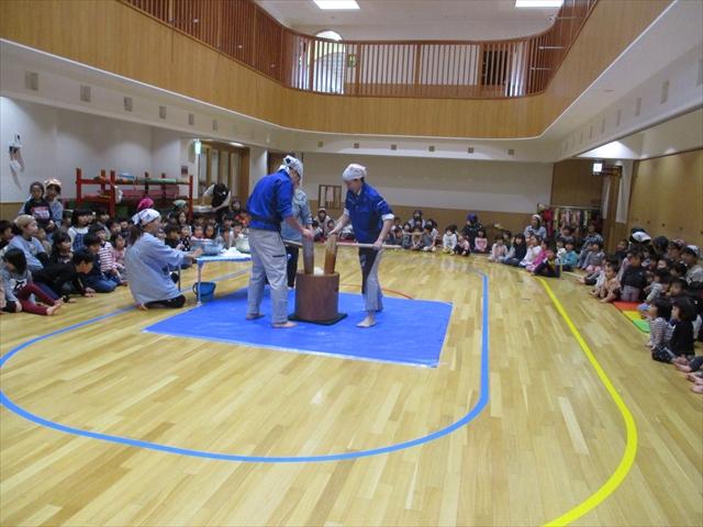 12月13日(金)おもちつきがありましたよ☆保育園を建ててくれた萩原建設の方が今年は3人来てくれて、こどもたちの前でおもちをついてくれましたよ^^細川製餡さんにいただいたあんこであんこもちを作ったり、給食でお雑煮、きなこもち、磯辺もちにして食べました!!建設会社の方や先生たちがおもちをつくところを応援し、おいしいおもちをおなかいっぱい食べて大満足なこどもたちでした^^