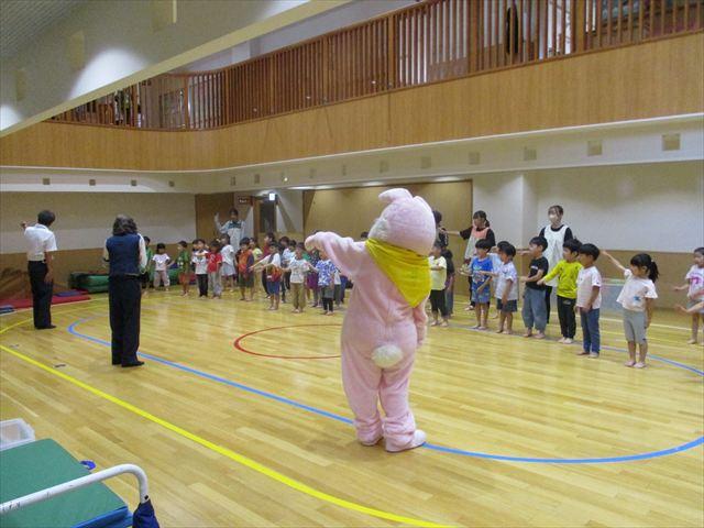 着ぐるみの「うさこちゃん」がでてきて、わかりやすく教えてもらった後、実際に子どもたちも